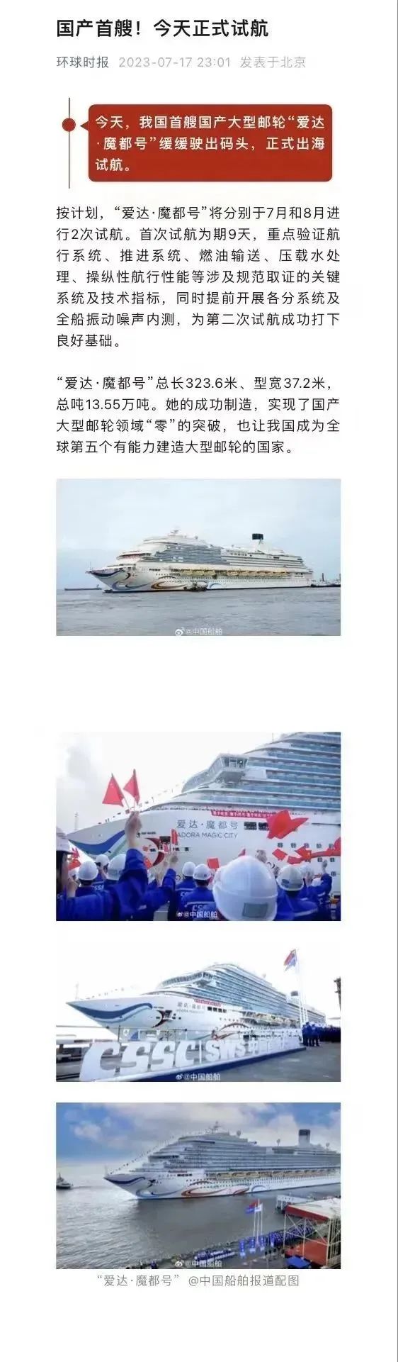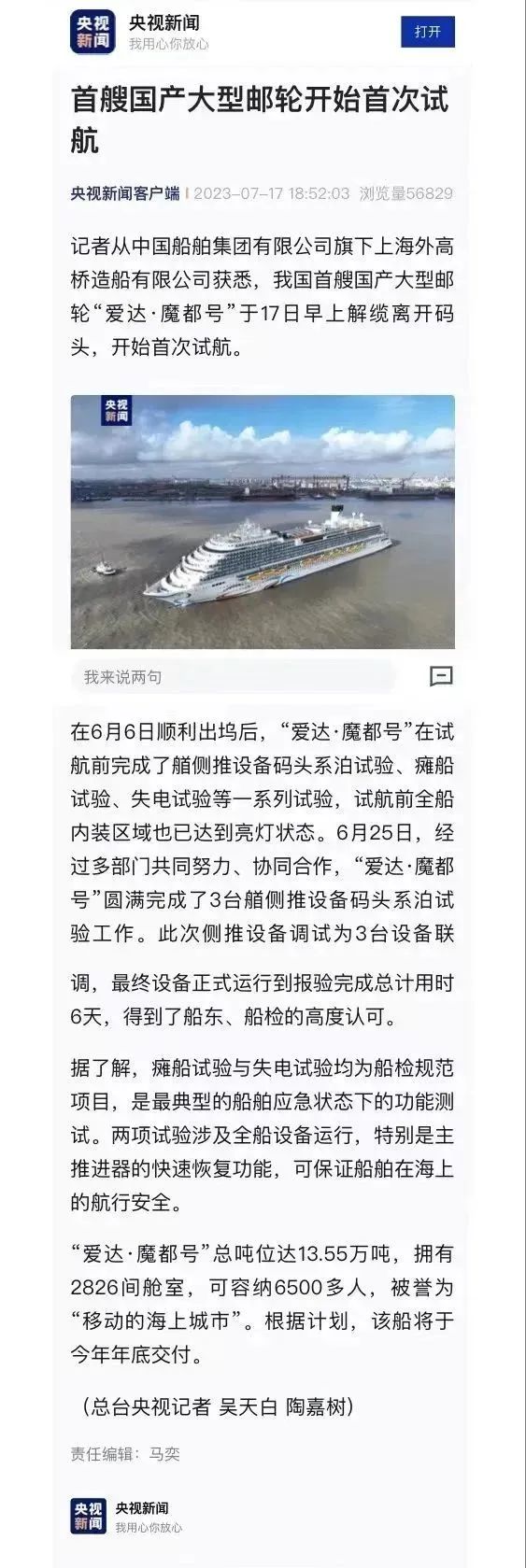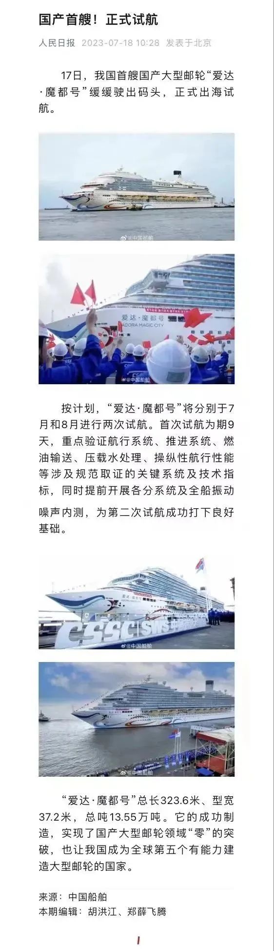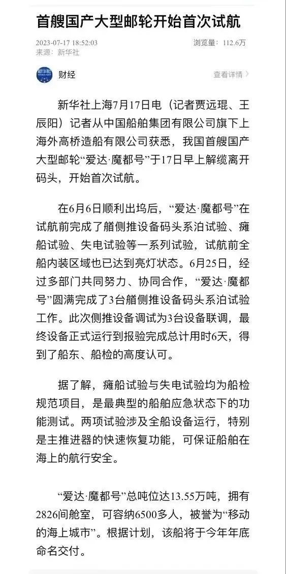 媒體聚焦| 國產(chǎn)首制大型郵輪試航刷屏!
